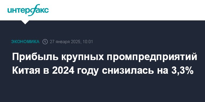 Москва. 27 января. INTERFAX.RU - Совокупная прибыль крупных промышленных компаний Китая в 2024 году снизилась на 3,3%, до 7,43 трлн юаней ($1,02 трлн), говорится в отчете Государственного статистического управления (ГСУ).