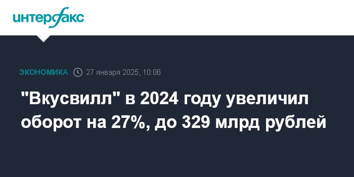 Москва. 27 января. INTERFAX.RU - Ритейлер "Вкусвилл" за 2024 год нарастил оборот (с НДС) на 27%, до 329 млрд рублей, сообщила компания.
