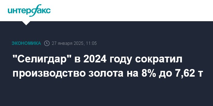 Москва. 27 января. INTERFAX.RU - Холдинг "Селигдар" (MOEX: SELG) по итогам 2024 года снизил производство лигатурного золота на 8% до 7,62 тонны, сообщила компания.