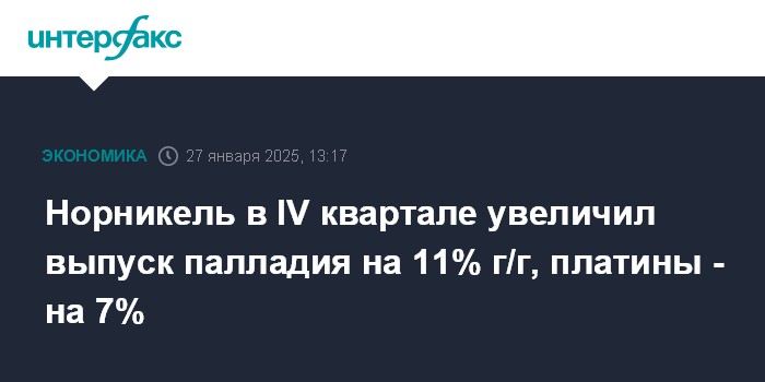 Москва. 27 января. INTERFAX.RU - "Норильский никель" в IV квартале 2024 года выпустил 606 тыс. унций палладия и 146 тыс. унций платины, сообщила компания.