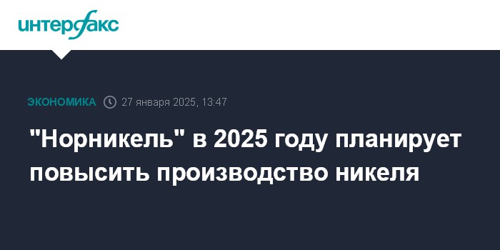 Москва. 27 января. INTERFAX.RU - "Норильский никель" в 2025 году планирует выпустить 204-211 тысяч тонн никеля, 353-373 тысячи тонн меди, сообщила компания.