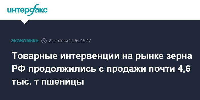 Товарные интервенции на рынке зерна РФ продолжились с продажи почти 4,6 тыс. т пшеницы