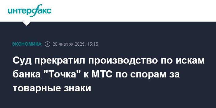 Москва. 28 января. INTERFAX.RU - Суд по интеллектуальным правам (СИП) во вторник прекратил производство по искам банка для предпринимателей "Точка" против "дочки" ПАО "МТС" – АО "Русская телефонная компания" (РТК).