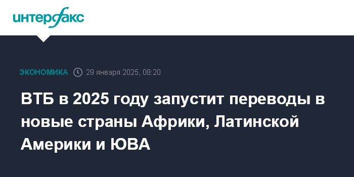 Москва. 29 января. INTERFAX.RU - ВТБ в 2025 году планирует расширить географию трансграничных переводов в национальных валютах, в планах новые страны Африки, Латинской Америки и Юго-Восточной Азии, заявил журналистам заместитель президента - председателя правления банка Георгий Горшков.