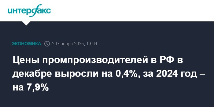 Цены промпроизводителей в РФ в декабре выросли на 0,4%, за 2024 год – на 7,9%