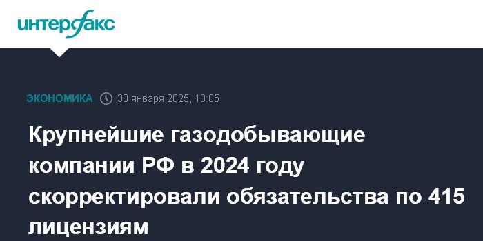 Крупнейшие газодобывающие компании РФ в 2024 году скорректировали обязательства по 415 лицензиям