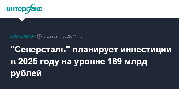 Москва. 3 февраля. INTERFAX.RU - ПАО "Северсталь" планирует инвестиции в 2025 году на уровне 169 млрд рублей. Из этой суммы на поддержание существующих мощностей будет направлено 81 млрд рублей, в проекты развития компания вложит еще 70 млрд рублей, говорится в сообщении "Северстали".