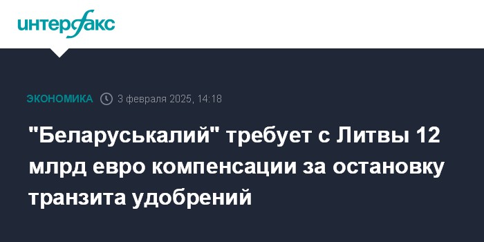Москва. 3 февраля. INTERFAX.RU - Белорусский производитель калийных удобрений "Беларуськалий" в иске против Литвы, поданном в Постоянную палату третейского суда (Permanent Court of Arbitration), требует компенсации $12 млрд ущерба из-за приостановки транзита удобрений, говорится в пресс-релизе арбитража.