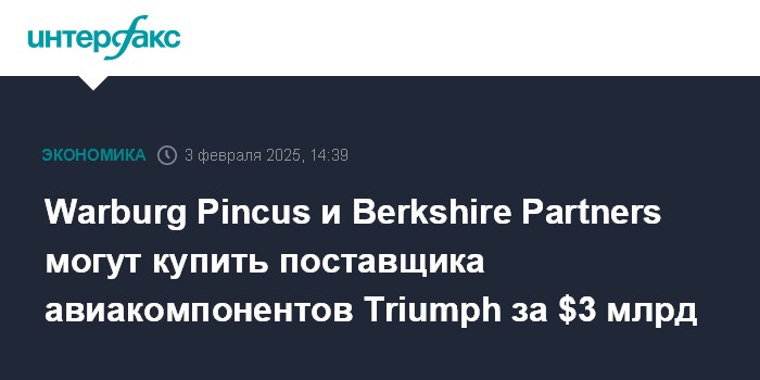 Москва. 3 февраля. INTERFAX.RU - Warburg Pincus и Berkshire Partners могут купить поставщика авиакомпонентов Triumph за $3 млрд - СМИ