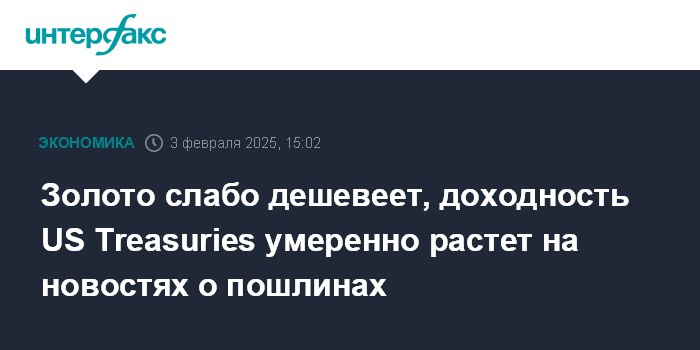 Москва. 3 февраля. INTERFAX.RU - Цена золота слабо снижается днем в понедельник, доходность американских государственных облигаций умеренно поднимается, а биткойн дешевеет после введения президентом США Дональдом Трампом пошлин на импорт товаров из Мексики, Канады и Китая.