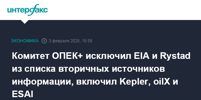 Москва. 3 февраля. INTERFAX.RU - Министерский мониторинговый комитет ОПЕК+ принял решение исключить из списка вторичных источников информации Управление информации Минэнерго США (EIA) и аналитическое агентство Rystad Energy, сообщается в пресс-релизе ОПЕК.