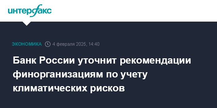 Москва. 4 февраля. INTERFAX.RU - Банк России уточнит рекомендации по учету климатических рисков финансовыми организациями и более подробно опишет методы их учета, сообщил регулятор.