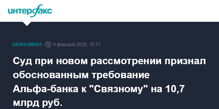 Москва. 4 февраля. INTERFAX.RU - Арбитражный суд Москвы 30 января по итогам нового рассмотрения признал обоснованным требование Альфа-банка к ритейлеру "Связной" на сумму 10,7 млрд рублей.
