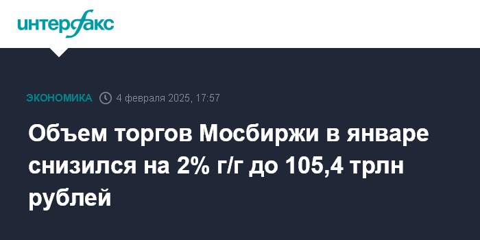 Объем торгов Мосбиржи в январе снизился на 2% г/г до 105,4 трлн рублей