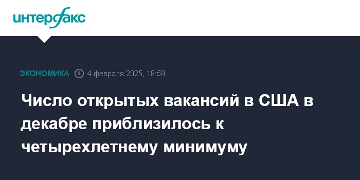 Москва. 4 февраля. INTERFAX.RU - Количество открытых вакансий в США в декабре уменьшилось на 556 тыс. относительно предыдущего месяца и составило 7,6 млн, говорится в отчете министерства труда страны, основанном на результатах ежемесячного опроса (JOLTS).