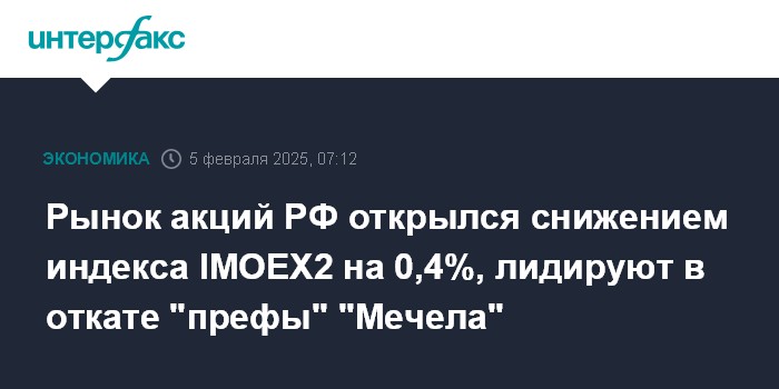 Рынок акций РФ открылся снижением индекса IMOEX2 на 0,4%, лидируют в откате "префы" "Мечела"