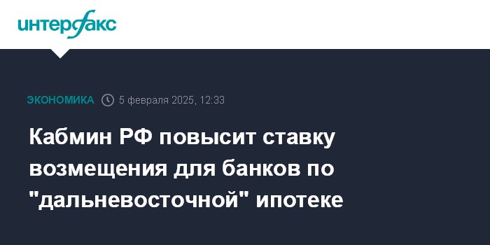Москва. 5 февраля. INTERFAX.RU - Правительство РФ с 7 февраля повысит ставку возмещения для банков по "дальневосточной" ипотеке, следует из обновленных условий программы "Дальневосточная и арктическая ипотека", опубликованных на сайте Минфина.