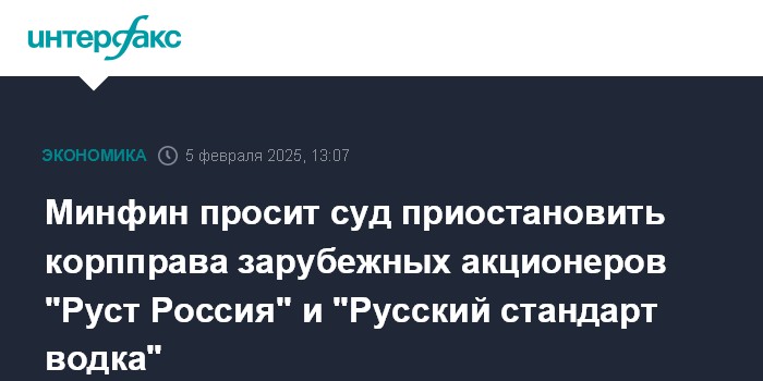 Минфин напомнил, что 15 ноября 2024 года правительство РФ включило АО "Руст Россия" и ООО "Русский стандарт водка" в перечень экономически значимых организаций. Таким образом, Минфину было предоставлено право на обращение в арбитражный суд с заявлением о приостановлении корпоративных прав их зарубежными акционерами.