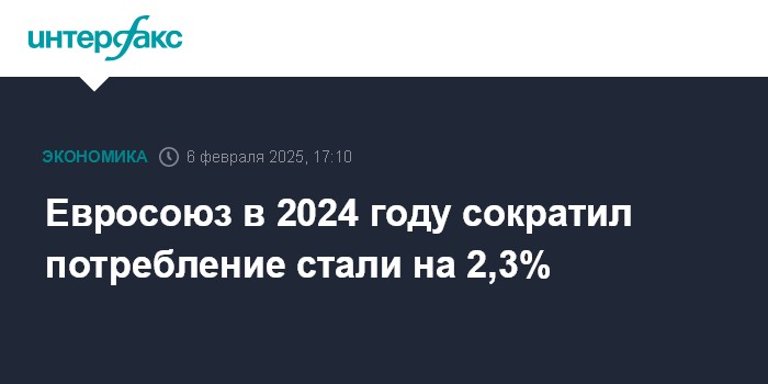 Москва. 6 февраля. INTERFAX.RU - Видимое потребление стали (учитывает общий объем выпуска стали, импорт и экспортные поставки) в странах Евросоюза в 2024 году, по предварительным оценкам Eurofer, упало на 2,3%, до 127 млн тонн.