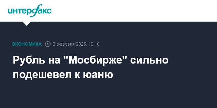 Москва. 6 февраля. INTERFAX.RU - На торгах четверга на "Московской бирже" рубль значительно подешевел к юаню упал после того, как в первой половине дня обновил максимальные отметки с середины сентября 2024 года.