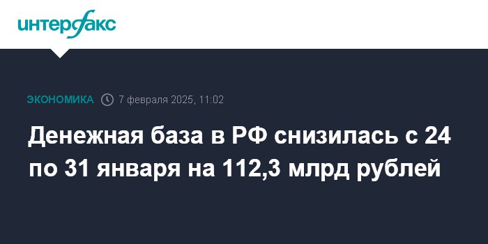 На 24 января денежная база в России равнялась 18 387 млрд рублей. Таким образом, за период она снизилась на 0,62%, или на 112,3 млрд рублей.