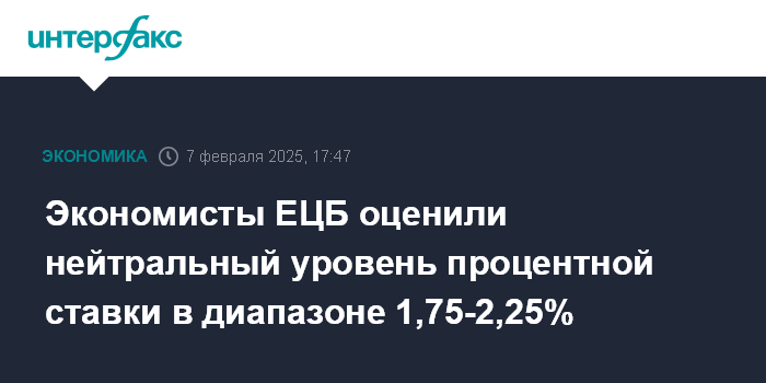 Москва. 7 февраля. INTERFAX.RU - Нейтральный уровень ключевой процентной ставки, при котором она не сдерживает, но и не стимулирует рост экономики, составляет 1,75-2,25%, показывают расчеты экономистов Европейского центробанка.