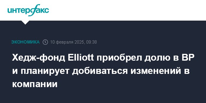 Москва. 10 февраля. INTERFAX.RU - Хедж-фонд Elliott Management приобрел долю в британской BP Plc и намерен добиваться изменений в нефтегазовой компании с целью повышения ее стоимости. Об этом пишет газета The Wall Street Journal со ссылкой на информированные источники.