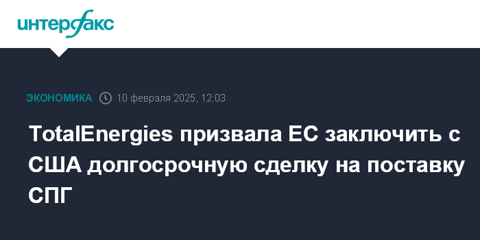 Москва. 10 февраля. INTERFAX.RU - Глава TotalEnergies Патрик Пуяннэ заявил, что готов способствовать увеличению поставок американского сжиженного природного газа в Европу, но призвал ЕС заключить с США долгосрочную сделку на поставку СПГ и заручиться гарантиями таких поставок, чтобы обеспечить себе энергетическую безопасность, пишет Financial Times.