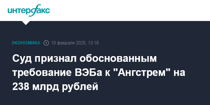 Москва. 10 февраля. INTERFAX.RU - Арбитражный суд Москвы 6 февраля признал обоснованным требование госкорпорации ВЭБ.РФ к производителю микропроцессоров и RFID-систем АО "Ангстрем"(Зеленоград) в размере 238,2 млрд рублей.