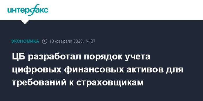 Москва. 10 февраля. INTERFAX.RU - Банк России разработал порядок учета цифровых финансовых активов в рамках проекта положения с корректировками подходов к требованиям регулятора по платежеспособности и финансовой устойчивости страховщиков, сообщает ЦБ.