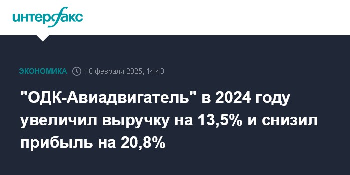 Москва. 10 февраля. INTERFAX.RU - АО "ОДК-Авиадвигатель" (Пермь, входит в "Объединенную двигателестроительную корпорацию") по итогам 2024 года получило 929,5 млн рублей чистой прибыли по РСБУ, что на 20,8% меньше, чем годом ранее, говорится в финотчетности компании.