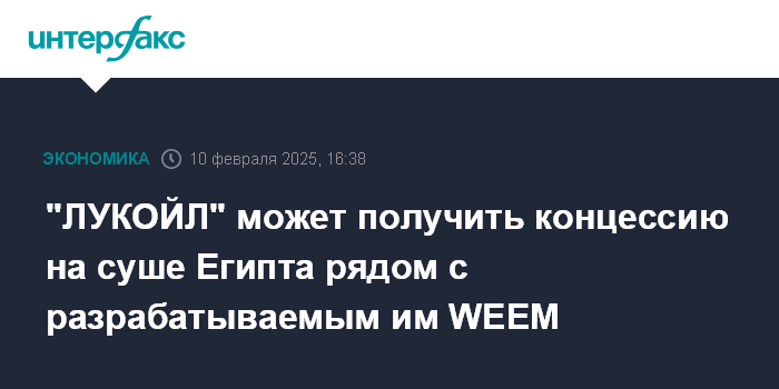 Москва. 10 февраля. INTERFAX.RU - "ЛУКОЙЛ" может расширить присутствие в Египте за счет новой концессии на суше. По данным интегрированной платформы Egypt Upstream Gateway, которая действует от имени министерства нефти и минеральных ресурсов Египта, российская компания заинтересована в получении блока South Wadi El-Sahl.