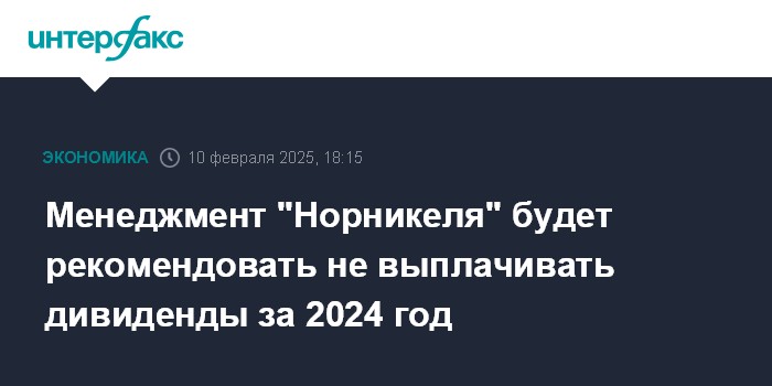 Москва. 10 февраля. INTERFAX.RU - Менеджмент ГМК "Норильский никель" будет рекомендовать совету директоров не выплачивать дивиденды за 2024 год, заявил первый вице-президент - финансовый директор "Норникеля" Сергей Малышев.