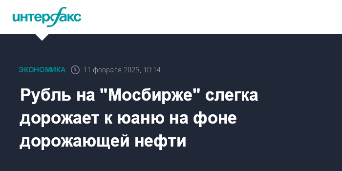 Москва. 11 февраля. INTERFAX.RU - Утром во вторник на "Московской бирже" рубль слегка дорожает к юаню на фоне дорожающей нефти.