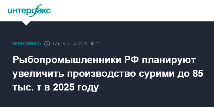 Москва. 12 февраля. INTERFAX.RU - РФ в 2025 году может увеличить производство сурими (сырье для выпуска так называемых "крабовых палочек") до 85 тыс. тонн с 70,8 тыс. тонн в 2024 году. Новым рынком сбыта этой продукции может стать Индия, считают во Всероссийской ассоциации рыбопромышлеников (ВАРПЭ).