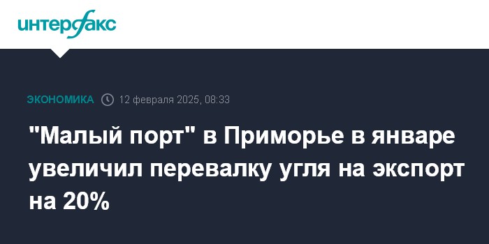 Москва. 12 февраля. INTERFAX.RU - ООО "Стивидорная компания "Малый порт" (оператор морского терминала в порту Восточный в Приморском крае, находится под управлением АО "Портовый альянс") в январе 2025 года увеличило перевалку угля на экспорт на 20% по сравнению с январем 2024 года, до 297,2 тыс. тонн, сообщается в телеграм-канале стивидора.