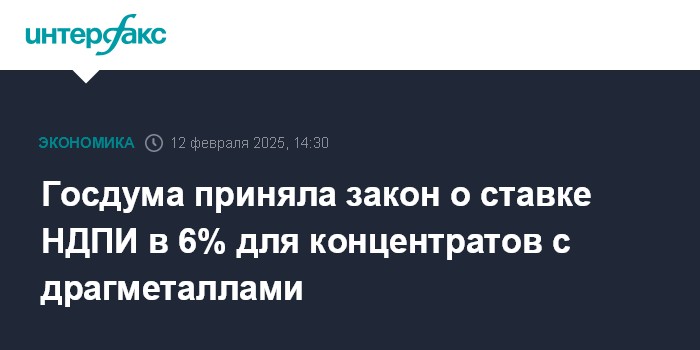 Москва. 12 февраля. INTERFAX.RU - Госдума приняла в третьем чтении закон, который устанавливает единую ставку НДПИ в размере 6% для концентратов и других полупродуктов, содержащих драгметаллы, что призвано упростить налогообложение и устранить споры о налоговой базе.