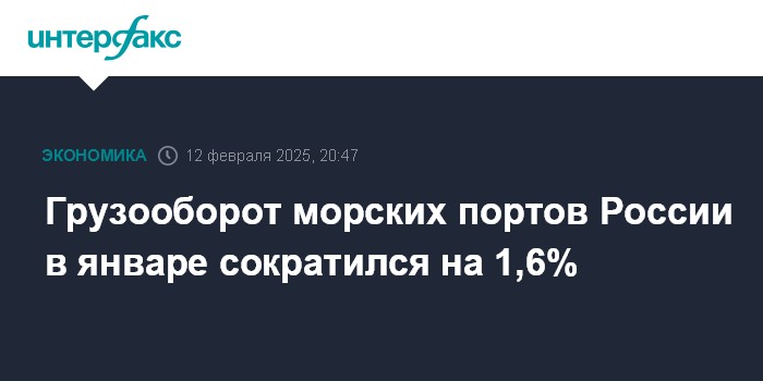 Москва. 12 февраля. INTERFAX.RU - Грузооборот морских портов России в январе 2025 года уменьшился на 1,6% по сравнению с аналогичным периодом 2024 года и составил 71,6 млн тонн, сообщает сайт Ассоциации морских торговых портов (АСОП).