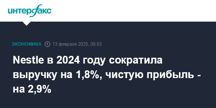 Москва. 13 февраля. INTERFAX.RU - Швейцарская Nestle, крупнейший производитель продуктов питания и безалкогольных напитков в мире, по итогам 2024 года сократила чистую прибыль на 2,9%, выручку - на 1,8%.