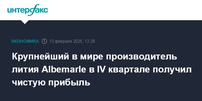Москва. 13 февраля. INTERFAX.RU - Американская Albemarle, крупнейший производитель лития в мире, завершила четвертый квартал 2024 года с чистой прибылью, хотя сократила выручку почти в два раза.