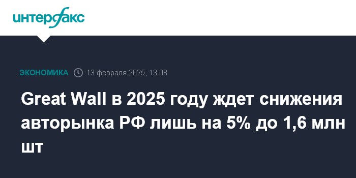 Great Wall в 2025 году ждет снижения авторынка РФ лишь на 5% до 1,6 млн шт