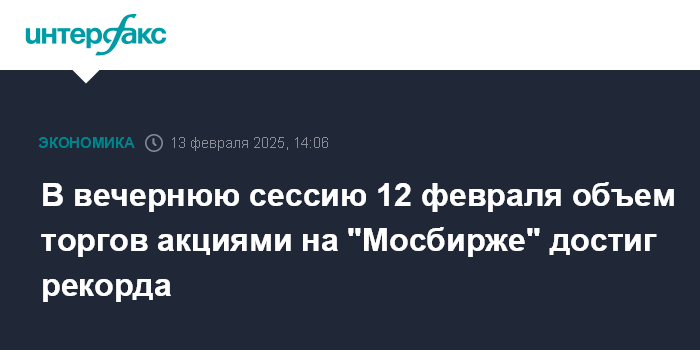 Москва. 13 февраля. INTERFAX.RU - "Московская биржа" зафиксировала максимальный за всю историю объем торгов акциями на вечерней сессии 12 февраля на уровне 237 млрд рублей, сообщил телеграм-канал площадки.