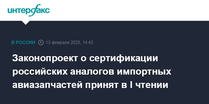 Москва. 13 февраля. INTERFAX.RU - Госдума приняла в первом чтении законопроект, который наделяет Росавиацию полномочиями по сертификации и одобрению производства альтернативных комплектующих для гражданской авиатехники, что необходимо для замещения иностранных запчастей в условиях санкций.