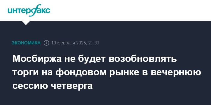 Москва. 13 февраля. INTERFAX.RU - "Московская биржа" решила не возобновлять торги на фондовом рынке в вечернюю сессию четверга, говорится в сообщении торговой площадки.