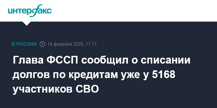 Москва. 14 февраля. INTERFAX.RU - Приставы за 2,5 месяца списали кредитные долги 5168 участникам специальной военной операции на сумму более 3 млрд рублей, сообщил журналистам директор Федеральной службы судебных приставов (ФССП) Дмитрий Аристов.