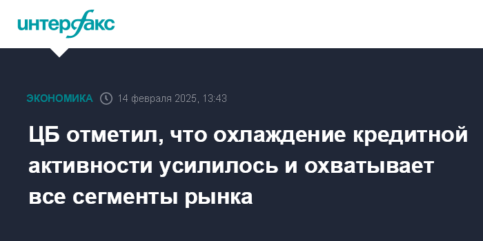 Москва. 14 февраля. INTERFAX.RU - Охлаждение кредитной активности усилилось и охватывает все сегменты кредитного рынка, неценовые условия банковского кредитования ужесточились, говорится в пресс-релизе ЦБ РФ по итогам совета директоров по ставке.