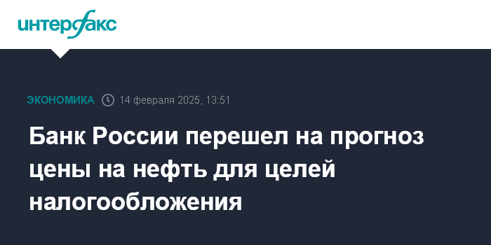 Москва. 14 февраля. INTERFAX.RU - Банк России в обновленном среднесрочном прогнозе указал прогноз средней цены на нефть марки Brent для целей налогообложения: в 2025 году ЦБ ожидает цену на уровне $65 за баррель.