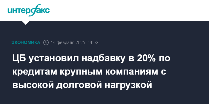 Москва. 14 февраля. INTERFAX.RU - Банк России установил с 1 апреля 2025 года надбавку к коэффициентам риска в размере 20% на прирост кредитных требований к крупным компаниям с повышенной долговой нагрузкой, говорится в сообщении регулятора.