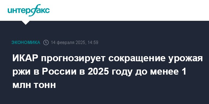 Москва. 14 февраля. INTERFAX.RU - В России сбор ржи в 2025 году может составить 0,9 млн тонн против 1,16 млн тонн в 2024 году, и эта культура перейдет в категорию нишевых. Такой прогноз представил гендиректор Института аграрного рынка (ИКАР) Дмитрий Рылько на конференции "Где маржа 2025".