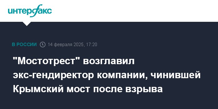 Москва. 14 февраля. INTERFAX.RU - Евгений Чибышев, экс-гендиректор компании "Нижнеангарсктрансстрой" (НАТС), которая ремонтировала Крымский мост после подрыва в 2022 году, утвержден во главе ПАО "Мостотрест", которое строило этот мост, сообщило ПАО.